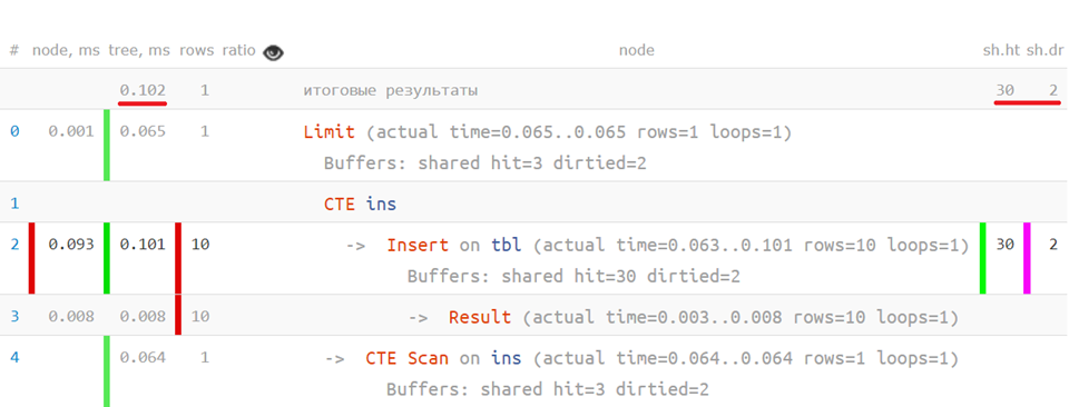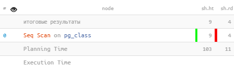 Summary statistics of nodes allows you to analyze plans of tens of thousands of rows in aggregated form sorted by any indicator: execution time or read from disk, the amount of data received from the cache, or the number of filtered rows.